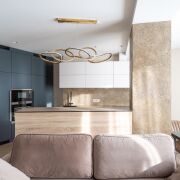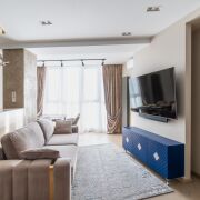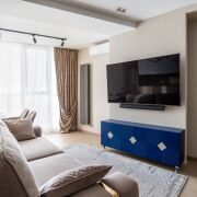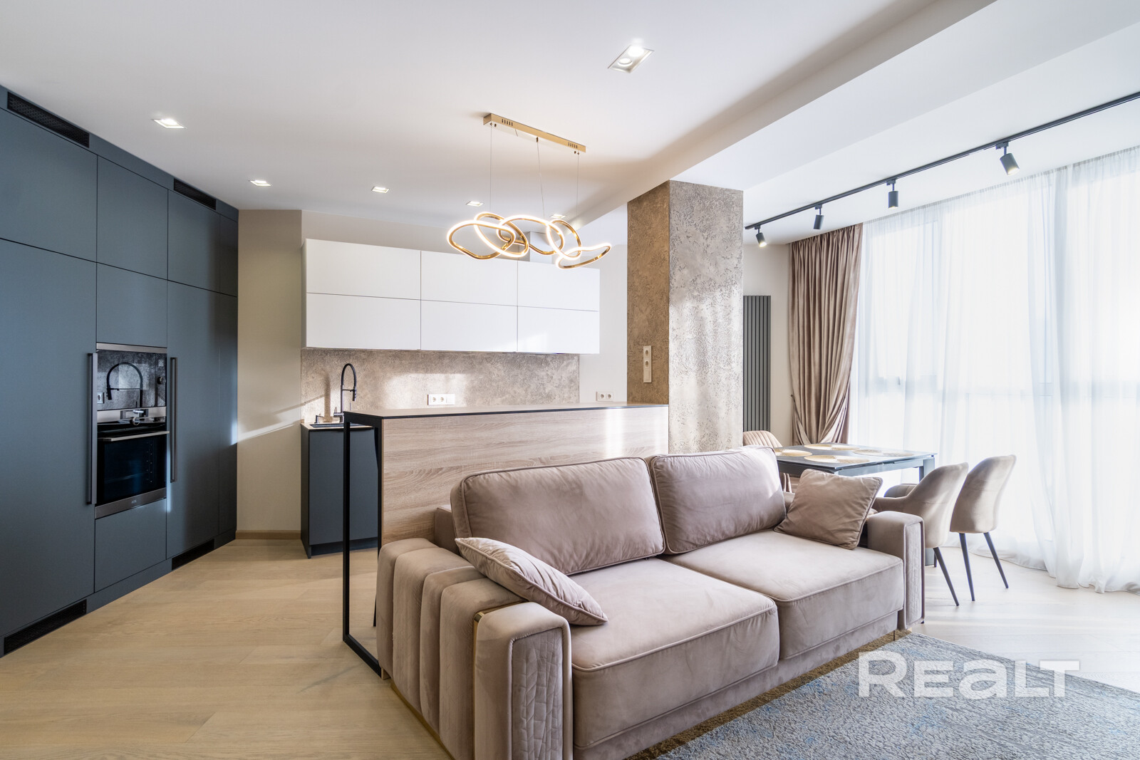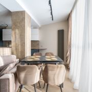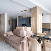 • Гостиная: Просторное помещение наполнено мягким светом, который льется из больших окон. Основным акцентом здесь служит стильный диван итальянского производства, обитый мягкой бархатной тканью нейтральных тонов с изящными металлическими акцентами.