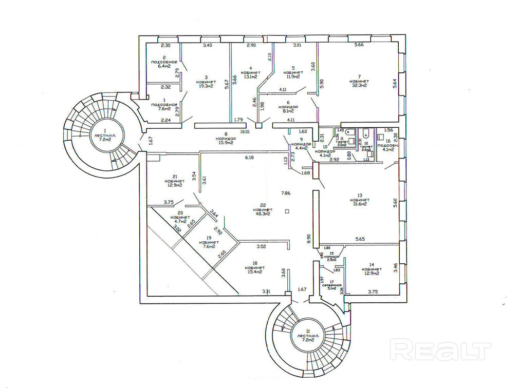Изолированный блок площадью 286.7 кв.м., включает 14 комнат (все с естественным освещением), собственный коридор и зона ресепшена, блок санузлов, комната приема пищи с кухней (вода, канализация).