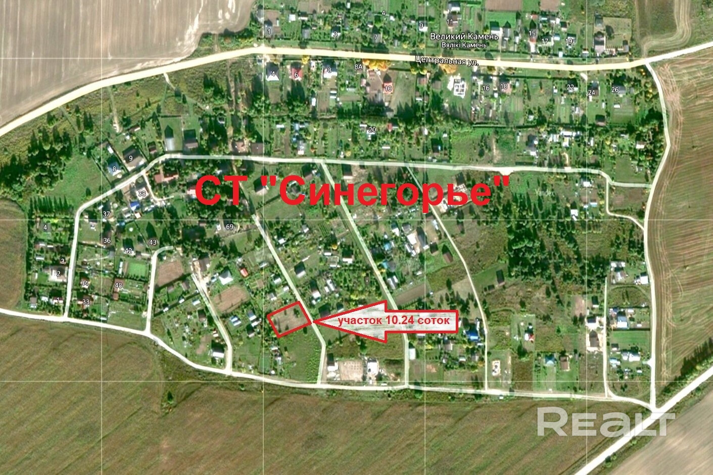 Земельный участок ровный прямоугольной формы площадью 10,24 сотки. Предоставлен в частную собственность.