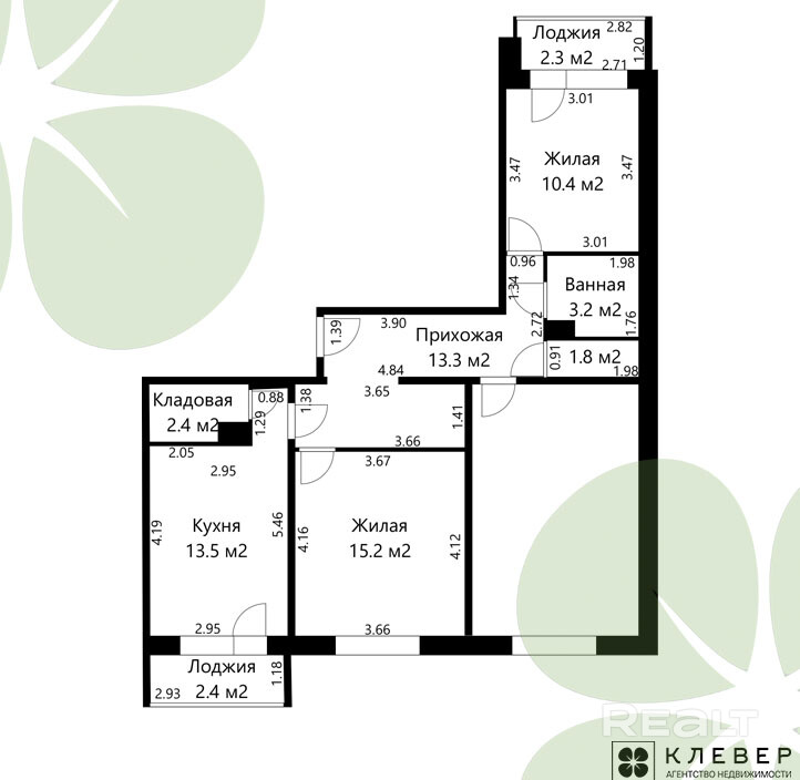Комнаты размером 15.2 и 10.4 метров квадратных.