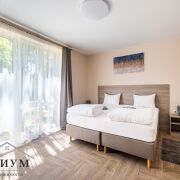 Открытый бассейн с подогревом 10*3 полностью оснащён автоматической профессиональной системой очистки и таймером. А герметичный купол позволяет использовать его с апреля по октябрь. Около бассейна установлены шезлонги и зонтики. А наличие волейбольной площадки и футбольных ворот порадуют активных гостей.