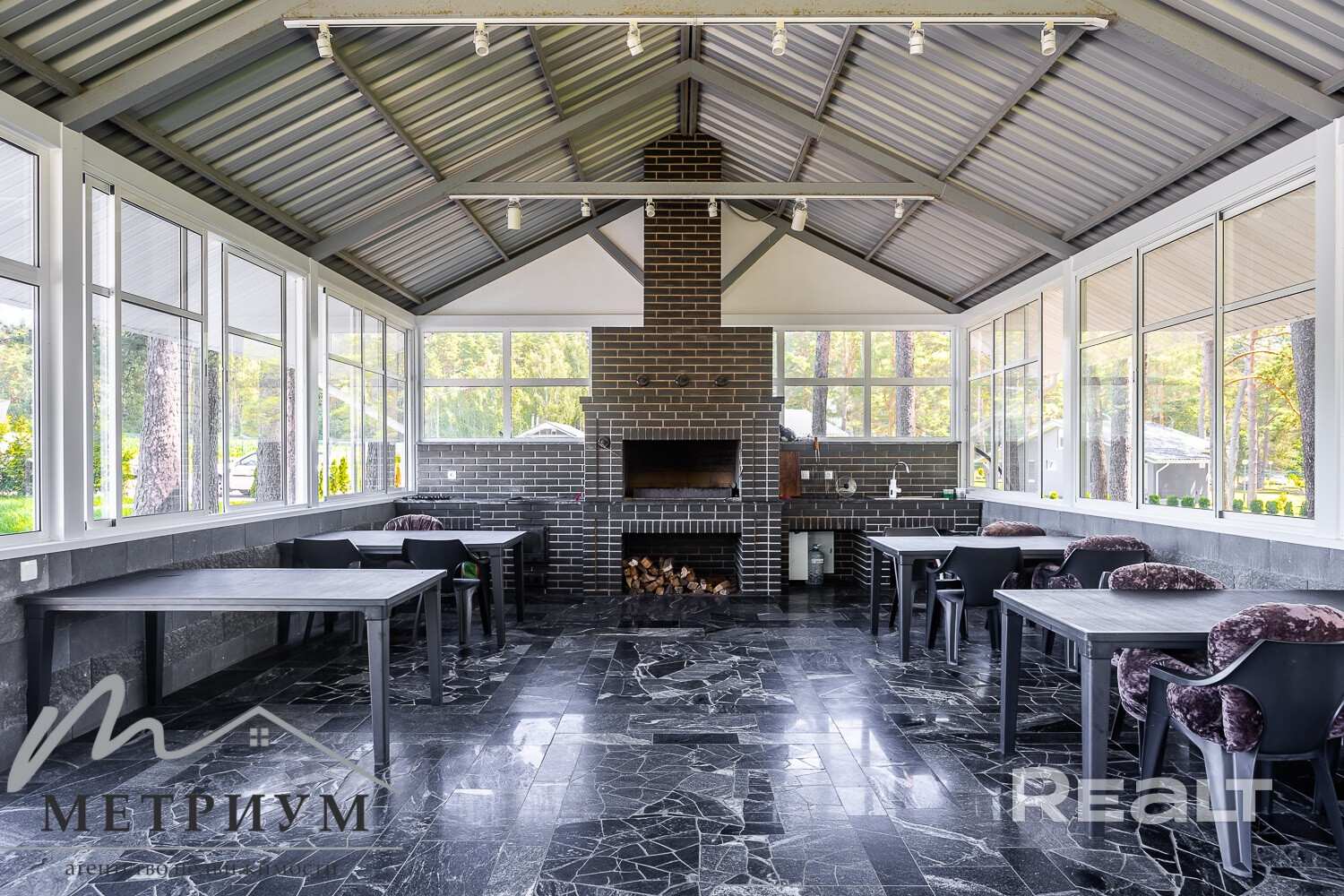Зона BBQ оборудована застеклённой беседкой на 40 человек, мангалом, казаном, решётками и шампурами.
