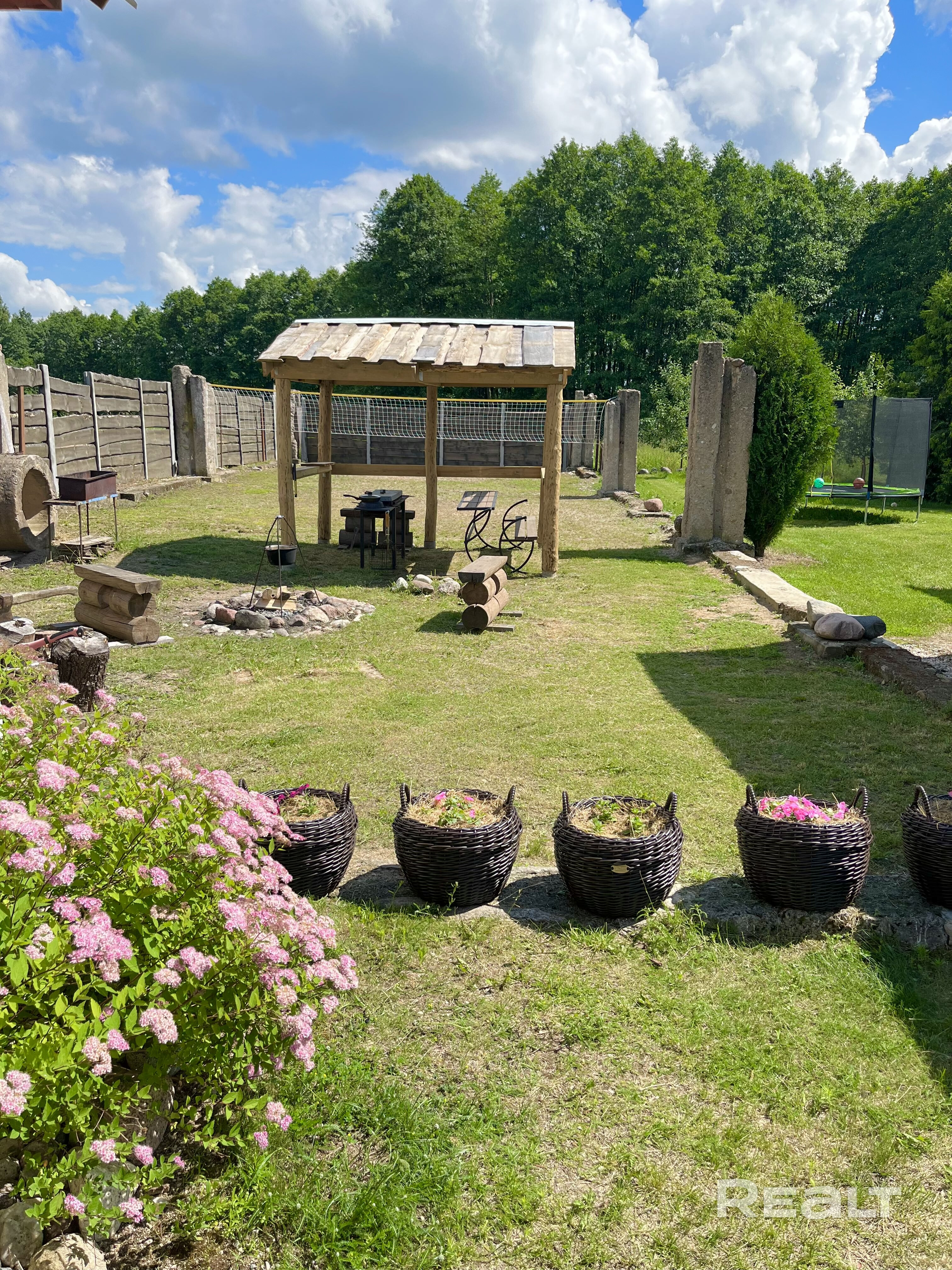 - Зона барбекю под ключ и под навесом: мангал, казан, решётки, шампуры, дрова, вода