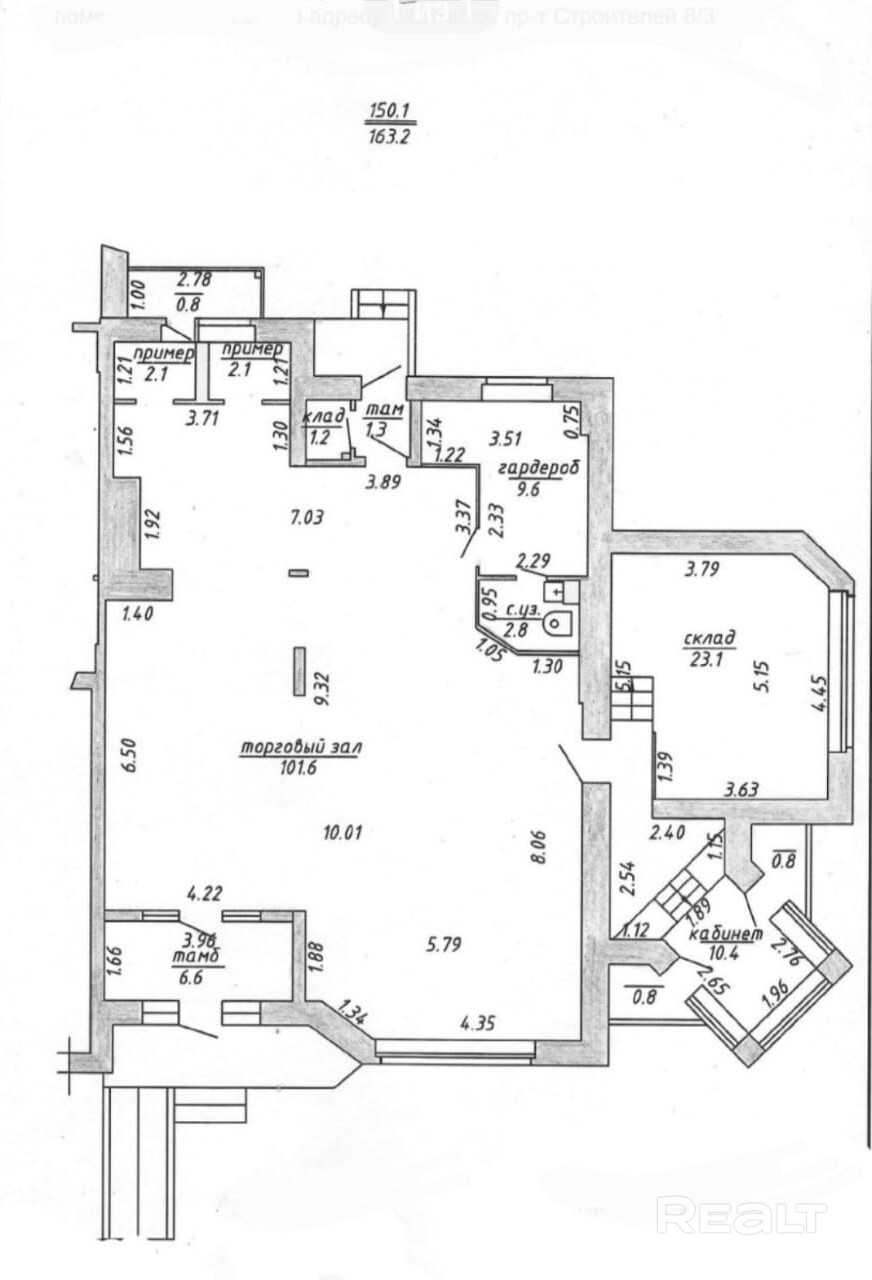 Аренда торгового помещения, по адресу: пр-т Строителей. Общая площадь - 163,2 кв.м., расположено на первом этаже одиннадцатиэтажного блочного жилого дома, построенного в 2005 году. Высота потолков — 2,5 м. В помещении есть санузел. Загрузка товара осуществляется со двора, что удобно для поставок и вывоза. Это универсальное пространство подходит для различных видов деятельности. Расположено в месте с высоким пешеходным трафиком, рядом находится большая парковка и остановка общественного транспорта, что обеспечивает удобство для клиентов.