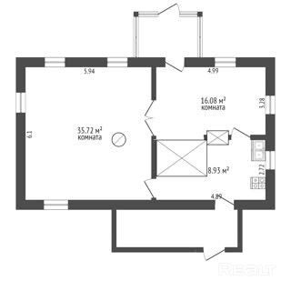Дом возведен из бруса общей площадью 60,74 м2. Стены возведены из бруса. Фундамент бутовый, глубиной 1,5 м. Перекрытия деревянные. Крыша шиферная. В доме имеются 2 комнаты (35,73м2, 16,08 м2) и кухня 8,93 м2. На всех окнах установлены деревянные рамы, входная дверь деревянная. Пол и потолок с OSB- плитами.